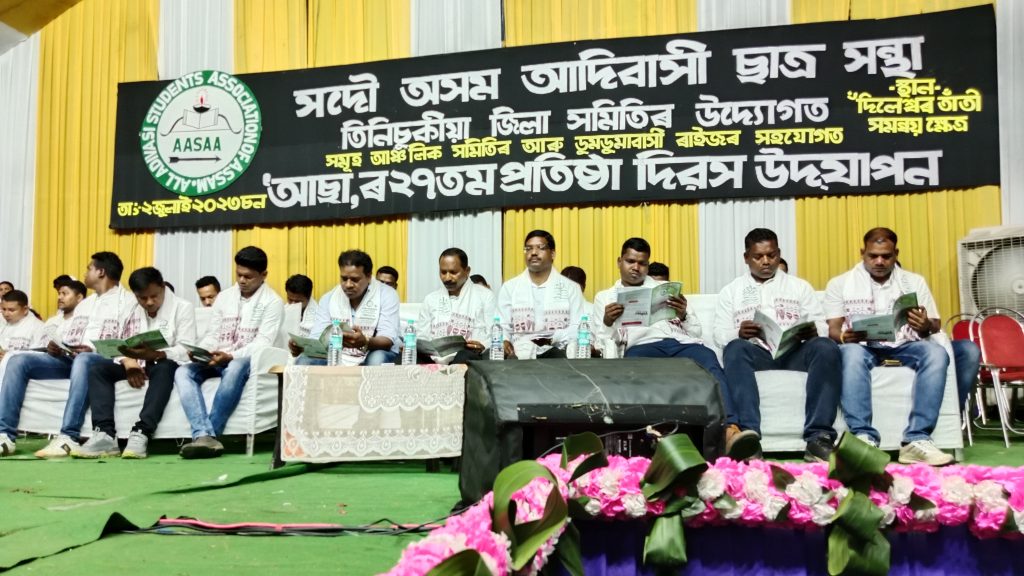 दुमदुमा 3 प्रेरणा भारती जुलाई : दुमदुमा नगर खेल मैदान में स्वर्गीय दिलेश्वर तांती समन्वय क्षेत्र में एक दिवसीय कार्यक्रम के अंतर्गत अखिल असम आदिवासी छात्र संस्था (आसा) ने अपना 27 वाॅ स्थापना दिवस का किया पालन किया गया ।आसा के तिनसुकिया जिला समिति के सौजन्य तथा समूह आंचलिक समिति व दुमदुमा के लोगों के सहयोग से आयोजित स्थापना दिवस के कार्यक्रम में सुबह झंडोत्तलन, स्मृति तर्पण ,सांस्कृतिक शोभायात्रा, आम सभा, शाम से आमंत्रित कलाकारों द्वारा सांस्कृतिक कार्यक्रम आयोजन की गई । शोभा यात्रा में आदिवासी जनक गोष्टी के अंतर्गत रहे विभिन्न जाति उपजाति लोगों द्वारा अपने परिधानों के साथ नगर की परिक्रमा की ।आम सभा का संचालन आयोजन कमेटी के अध्यक्ष जोसेफ बडिंग ने किया ।इस सभा में आसा केन्द्रीय सभापति प्रदीप नाग ,राज्य के श्रम चाय जनजाति मंत्री संजय किसान सहित राज्य के विभिन्न जिलों के प्रतिनिधियों के साथ विभिन्न दल संगठनों के नेताओं ने भाग लिया। आम सभा, स्मृति ग्रंथ विमोचन, पुरस्कार वितरण की गई । आसान के स्थापना दिवस पर चाय जनजाति के ज्वलंत मुद्दों के अलावा आदिवासी जन समूह के सर्वागीण विकास,मौलिक अधिकार आदि पर चर्चा की गई।