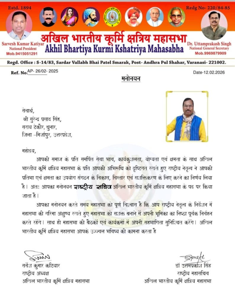 मिर्जापुर (उत्तर प्रदेश)। समाजिक संगठन को मजबूती प्रदान करने की दिशा में एक महत्वपूर्ण निर्णय लेते हुए अखिल भारतीय कूर्मि क्षत्रिय महासभा ने सुरेन्द्र प्रसाद सिंह को राष्ट्रीय सचिव पद पर मनोनीत किया है। श्री सिंह सराय टेकौर, चुनार, जिला मिर्जापुर के निवासी हैं और समाज सेवा के क्षेत्र में सक्रिय भूमिका निभाते रहे हैं।