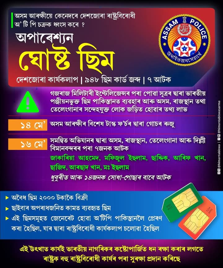 मुख्यमंत्री ने सोशल मीडिया के जरिए गुरुवार को बताया कि असम पुलिस ने एक बड़े ऑपरेशन के तहत 948 अवैध सिम कार्ड जब्त किए हैं और इस मामले में सात लोगों को गिरफ्तार किया है। यह नेटवर्क पाकिस्तान प्रायोजित साइबर अपराधों को बढ़ावा देने में संलिप्त था।