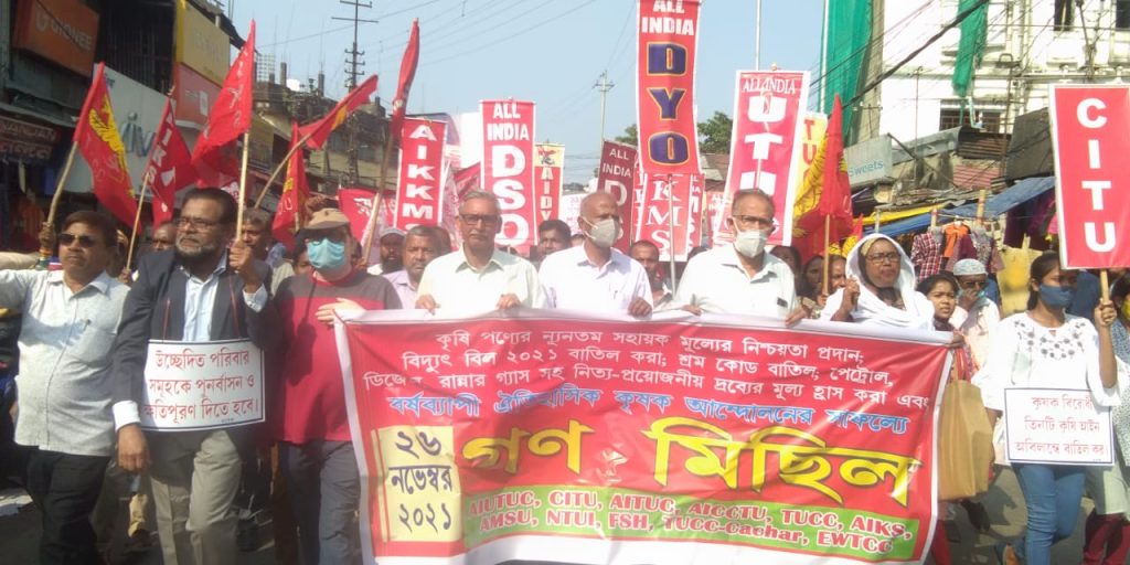 ऐतिहासिक किसान आंदोलन की पहली वर्षगांठ और प्रधान मंत्री द्वारा कृषि कानून को निरस्त करने की घोषणा के मद्देनजर, सिलचर में वामपंथी श्रमिकों, किसानों, छात्रों, युवाओं और महिला संगठनों की संयुक्त पहल पर आज एक विशाल जन जुलूस निकाला गया। अखिल भारतीय कृषक सभा, अखिल भारतीय किसान क्षेत्रमजदुर संगठन, असम मजूरी श्रमिक संघ, एआईएमयूटीयूसी, एआईसीसीटीयू, एआईटीयूसीयू, सीटूयू, टीयू सिलचर के नरसिंगटोला मैदान से शुरू हुआ.सीसी, फोरम फॉर सोशल हार्मनी, टीयूसीसी (कछार), सहित विभिन्न संगठनों के नेताओं और कार्यकर्ताओं ने नज़ीरपट्टी, प्रेमतला, हॉस्पिटल रोड से मार्च किया और रंगीरखारी में शहीद बेदी के पैर में जमा हुए। जुलूस में शामिल विभिन्न संगठनों के कर्मचारी