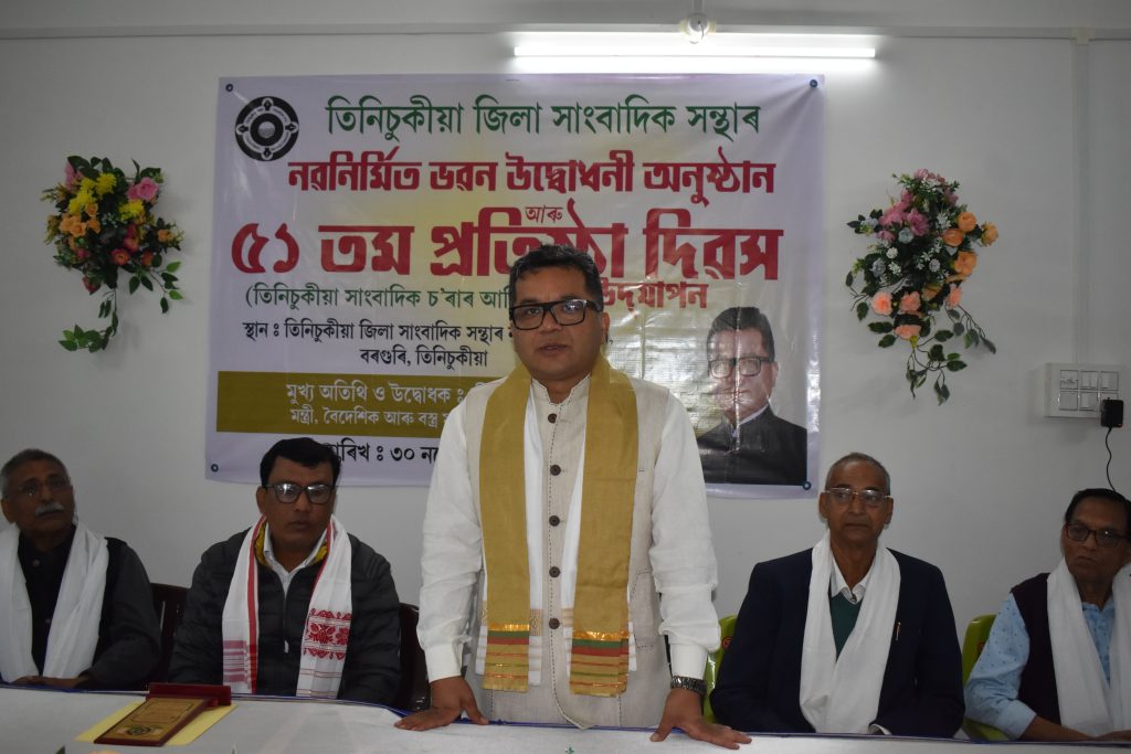 तिनसुकिया प्रेरणा भारती 30 नवंबर –आज तिनसुकिया जिला पत्रकार संघ के 51 वे स्थापना दिवस के अवसर पर तिनसुकिया के बरगुडी स्थित जिला पत्रकार संघ के नवनिर्मित भवन का लोकार्पण विदेश तथा वस्त्र राज्य मंत्री पवित्र मार्गरेटा द्वारा किया गया।इस अवसर पर तिनसुकिया जिला पत्रकार संघ एवं तिनसुकिया प्रेस क्लब के आथित्य में कार्यक्रम कि शुरुआत मांगलिक कार्य के साथ किया गया।जिला पत्रकार संघ का ध्वजारोहण तिनसुकिया जिला पत्रकार संघ के अध्यक्ष डॉ.ऋषि दास ने किया,वही शहिद बेदी पर दिवंगत पत्रकारों को वरिष्ठ पत्रकार हेमंत भट्टाचार्य द्वारा श्रद्धासुमन अर्पित की गई।वही लोकप्रिय गायक जुबिन गर्ग एवं भारतरत्न सुधाकंठ डॉ.भुपेन हजारिका के तस्वीर के समक्ष वरिष्ठ पत्रकार अमुल्य खटनियार द्वारा दीप प्रज्ज्वलित किया गया।इस दौरान आयोजित आम सभा में विदेश तथा वस्त्र राज्य मंत्री पवित्र मार्गरेटा को फुलाम गमछा मोमेंटो सेलेगं चादर प्रशस्ती पत्र दे कर सम्मानित किया गया। तिनसुकिया पत्रकार संघ का नव निर्मित भवन मंत्री पवित्र मार्गरेटा के सांसद पूंजी से आवंटित धनराशि से निर्माण किया है एवं तिनसुकिया विधायक संजय किसान द्वारा नव निर्मित भवन में फर्नीचर प्रदान किया है।इस कार्यक्रम में मटक ऑटोनोमस कॉउंसिल के अध्यक्ष सरोज गोहाई,तिनसुकिया नगरपालिका के अध्यक्ष पुलक चेतिया,तिनसुकिया विकाश प्राधिकरण के अध्यक्ष काजल गोहाई,असम हाइड्रो कार्बन एंड एनर्जी लिमिटेड के उपाध्यक्ष शिवजी दुबे,पूर्व अतिरिक्त आयुक्त योगेश दास,अखिल असम छात्र संस्था के सहायक महासचिव समरज्योति गोहाई,मोरान स्वायत शासित परिषद के अरूण ज्योति मोरान सहित विभिन्न दल संगठनों प्रतिनिधि तथा कई गन्यमाण व्यक्ति उपस्थित थे। कार्यक्रम कि संचालन जिला पत्रकार संघ के सचिव राणा ज्योति नेउग ने किया एवं पत्रकारो कि मत विनिमय कार्यक्रम की संचालन दुमदुमा प्रेस क्लब के अध्यक्ष मनोज दत्त द्वारा की गई।आज तिनसुकिया जिला पत्रकार संघ कि नये आशियाना से पत्रकारों में खुशी देखा गया। मालूम हो कि नव निर्मित भवन कि भूमि जिला प्रशासन द्वारा आवंटित किया गया है। सचिव राणा ज्योति नेउग एवं सभी पत्रकारों ने केन्द्रीय राज्यमंत्री पवित्र मार्गरेटा जिला प्रशासन को धन्यवाद दिया