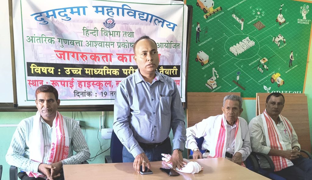दुमदुमा प्रेरणा भारती 20 नवम्बर :- आगामी प्रवेश परीक्षा के लिए मैट्रिक की छात्र – छात्रा कैसे तैयारी करे तथा विभिन्न विषयों की परीक्षा में बरतने वाली सावधानियां आदि को लेकर आज दुमदुमा काॅलेज में हिंदी विभाग के सौजन्य तथा काॅलेज के आंतरिक गुणवत्ता आश्वासन कोष के सहयोग से छात्र -छात्राओं के बीच विचारों का आदान – प्रदान का एक दिलचस्प कार्यक्रम आयोजन किया गया। रुपाई हाई स्कूल के दशम श्रेणी के सैकड़ों विद्यार्थिओं ने कार्यक्रम में उपस्थित होकर कार्यक्रम का लाभ उठाया । कार्यक्रम के शुभारंभ के समय दुमदुमा काॅलेज के प्राचार्य डॉ. कमलेश्वर कलिता ने पढ़ाई को लेकर विद्यार्थियों को कई महत्वपूर्ण परामर्श दिए। उन्होंने विद्यार्थियों से विचारों का आदान-प्रदान करते हुए छात्रों से प्रतिदिन आठ से दस घंटे पढ़ाई पर ध्यान केंद्रित करने को कहा। उन्होंने प्रवेश परीक्षा के लिए एक उम्मीदवार के रूप में ध्यान केंद्रित करने वाले पहलुओं पर भी कई उपदेश दिए। कार्यक्रम में विशिष्ट अतिथि के रूप में उपस्थित वरिष्ठ पत्रकार अर्जुन बरुवा ने छात्रों के हित में कई महत्वपूर्ण बातें बताई । कार्यक्रम का संचालन दुमदुमा काॅलेज के हिंदी विभाग के प्रमुख प्राध्यापक हिरण्य वैश्य दत्त ने किया। काॅलेज के आंतरिक गुणवत्ता आश्वासन कोष के सह-समन्वयक डॉ. लोकमन अली ने परीक्षा के लिए खुद को कैसे तैयार किया जाए इस विषय पर कई जरुरी उपदेश प्रदान किए। रुपाई उच्चतर माध्यमिक विद्यालय के शिक्षक अनूप बरदोलै के मेजबानी में स्वागत भाषण के बाद काॅलेज के हिंदी विभाग के प्रमुख प्राध्यापक हिरण्य वैश्य दत्त तथा प्राध्यापक परीक्षित नाथ ने छात्रों के साथ बातचीत करते हुए विभिन्न तकनीक दिए और छात्र विभिन्न विषयों में खुद को कैसे तैयार करे इस संबंध में कई कौशल सिखाए। उन्होंने छात्रों को यह भी सिखाते हैं कि ओएमआर प्रणाली के माध्यम से परीक्षा देते समय उन्हें किन विषयों पर ध्यान केंद्रित करना चाहिए। उन्होंने आने वाले दिनों में परीक्षा से कुछ दिन पहले दिन-रात पढ़ाई करने में आने वाली कठिनाइयों पर भी चर्चा करते हुए कई उपदेश दिए। विद्यालय के छात्रों से बातचीत करने पर छात्रों ने बताया कि उन्होंने विचारों के आदान-प्रदान से बहुत कुछ सीखा है। काॅलेज आने वाले दिनों में भी विभिन्न क्षेत्रों में छात्रों की सहायता करने की अपनी प्रतिबद्धता जारी रखने पर सहमत हुआ।