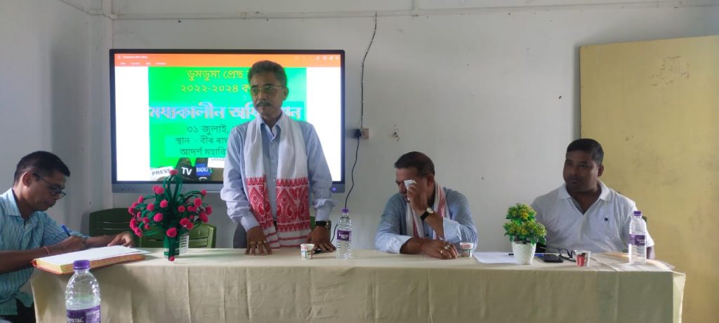 दुमदुमा प्रेरणा भारती 31 जुलाई :– दुमदुमा प्रेस क्लब का मध्यकालीन एक दिवसीय अधिवेशन आज वीर राघव मोरान सरकारी आदर्श महाविद्यालय में सम्पन्न हुआ । आज सुबह 9 बजे दुमदुमा प्रेस क्लब कार्यालय परिसर में क्लब के सभापति अनुज कलिता ने क्लब का झंडा फहराया वहीं सचिव मनोज बरुआ ने शहीद तर्पण किया व उपस्थित सदस्यों ने भी शहीद वेदी पर पुष्पांजलि अर्पित किया । इसके बाद दोपहर 11 बजे से रुपाई साइडिंग स्थित वीर राघव मोरान सरकारी आदर्श महाविद्यालय के प्रेक्षागृह में मध्यकालीन अधिवेशन क्लब के अध्यक्ष अनुज कलिता के सभापतित्व में आयोजित किया गया । जिसमें तिनसुकिया जिला पत्रकार  संस्था के सचिव राणा ज्योति नेउग ने इस अधिवेशन के शुभारंभ की घोषणा की व बीर राघव मोरान सरकारी आदर्श महाविद्यालय के प्रिंसिपल डा अमर ज्योति सैकिया ने स्वागत भाषण दिया । इससे पूर्व अतिथियों का फुलाम गमछा से सम्मानित किया गया। दुमदुमा प्रेस क्लब के सचिव मनोज बरुआ ने एक वर्ष के कार्यकाल के  कार्यों का  सचिव प्रतिवेदन पाठ किया वहीं कोषाध्यक्ष पित्तर चन्द मित्तल ने एक वर्ष के आय व्यय का व्यौरा प्रस्तुत किया । जिसे सभा ने सर्वसम्मति से पारित किया। इसके बाद सभा ने दुमदुमा अंचल और गांव अंचलों की विभिन्न समस्याओं पर विचार विमर्श किया और अंचल के विभिन्न समस्याओं के पहल हेतु  सरकार और प्रशासन अवगत कराने का  कई महत्वपूर्ण सिद्धांत लिया गया । सभा के अंत में  क्लब के सचिव मनोज बरुआ द्वारा  धन्यवाद प्रस्ताव देने  के बाद सभा का समापन किया गया।