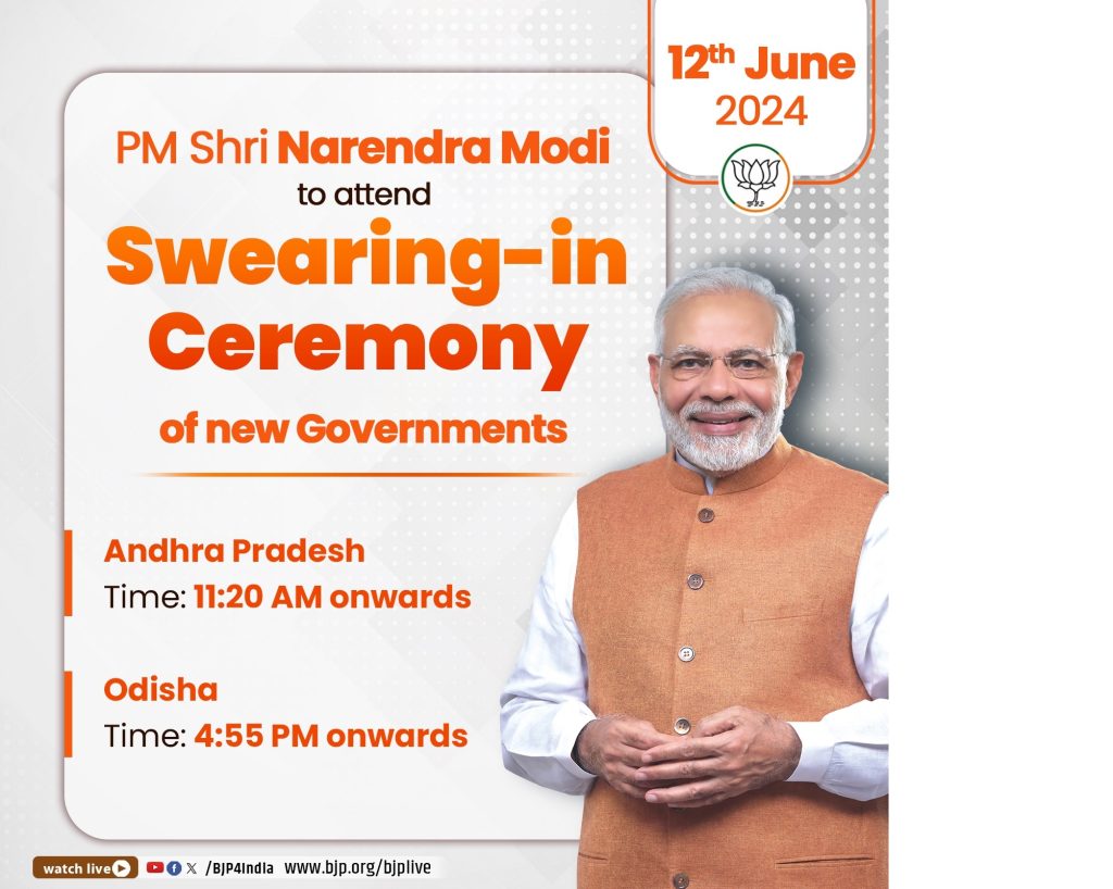 भाजपा के अनुसार, प्रधानमंत्री नरेन्द्र मोदी आंध्र प्रदेश के शपथ ग्रहण समारोह में सुबह 11ः20 और ओडिशा सरकार के शपथ ग्रहण समारोह में शाम साढ़े 4ः55 बजे हिस्सा लेंगे। उल्लेखनीय है कि तेलुगु देशम पार्टी प्रमुख एन चंद्रबाबू नायडू का मुख्यमंत्री की भूमिका में यह चौथा कार्यकाल होगा। नायडू विजयवाड़ा के बाहरी इलाके में गन्नावरम हवाई अड्डे के पास केसरपल्ली आइटी पार्क में शपथ लेंगे। मंगलवार को तेलुगू देशम विधायक दल और राजग के घटक दलों ने नायडू को अपना नेता चुना था।
