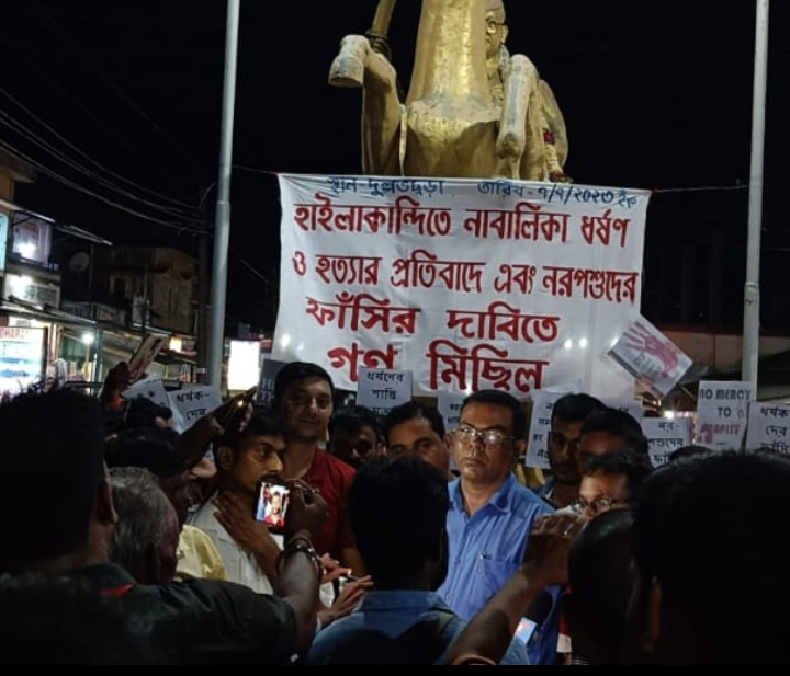 मोहनपुर बर्निब्रिज जघन्यतम कांड में पीड़िता के परिवार को न्याय दिलाने केलिए गत दिनांक 07 जुलाई 2023 शुक्रवार की शाम दुल्लभछोड़ा में चाय जनशक्ति संघ के आह्वान पर नागरिकों द्वारा प्रतिवादी सड़क मार्च निकाला गया, जिसमें करीबन ढाई तीन सौ लोगों की उपस्थिति दर्ज की गई। दुल्लभछोड़ा गाँव पंचायत से शुरू होकर सड़क मार्च दुल्लभछोड़ा पोस्ट ऑफिस और हरेकृष्ण एमबी स्कूल से होते हुए नेताजी सुभाषचंद्र बोस के प्रतिमा के नीचे आकर खत्म हुआ। सड़क मार्च खत्म होने के बाद नेताजी प्रतिमा स्थल पर ही पीड़िता की तस्वीर रखकर उसे श्रद्धांजलि अर्पित की गई। नागरिक वर्ग की ओर से मीडिया कर्मियों से बात करके हुए शिक्षक दिवाकर राय ने इस जघन्यतम वारदात को दिल्ली में हुए निर्भया कांड के समकक्ष बताकर कहा दोषियों पर धारा 302 के तहत मुकदमा दर्ज करना चाहिए। लेखक तथा सामाजिक कार्यकर्ता राजदीप राय ने इस मसले पर आक्रोश व्यक्त करते हुए कहा कि फरार चल रहे मुख्य अभियुक्त जुबेर अहमद को यथाशीघ्र पकड़कर तीनों अभियुक्तों पर निर्भया कांड के बाद बने कानून की कठोर धाराओं को लगाकर राम जन्मभूमि विवाद की तरह फर्स्ट ट्रैक कोर्ट में रोजाना सुनवाई करके तीन महीने के भीतर फांसी की सजा दी जाए। अगर ऐसा नहीं होता है, युवा पीढ़ी के भीतर धधक रही आग बाहर आ सकती है। सामाजिक कार्यकर्ता सुरेन्द्र यादव ने पीड़िता के गांव का रिलिजियस डेमोग्राफी पर ध्यान देते हुए कहा की पूरे गाँव में सिर्फ दो तीन परिवार को छोड़कर एक खास मजहब से लोग हैं ऐसे में पीड़िता के परिवार को सुरक्षा मुहैया करवाई जाए। इसके अलावा एडवोकेट पंकज राय शर्मा, शिक्षक समाजसेवी अनूप कोइरी आदि सबने एक स्वर में दोषियों को फांसी की सजा देने का मांग किया।