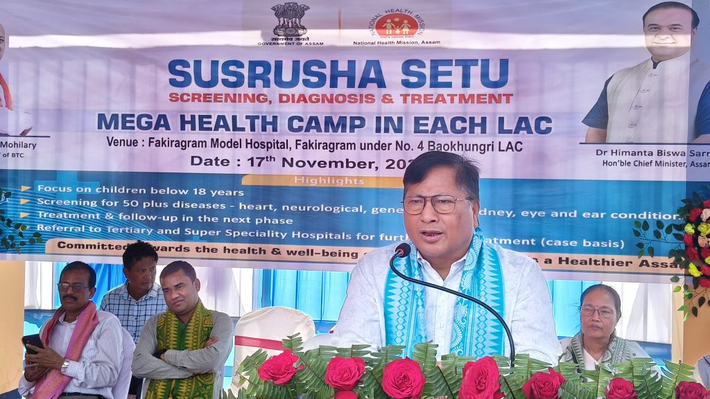 कोकराझार, 17 नवंबर। कोकराझार जिले के माइनारतल मे स्थित फकीराग्राम मॉडल हस्पताल मे आज बाऊखूंगारी बिधान सभा समष्टि स्तरीय एक मैगा मेडिकल कैंप का आयोजन किया गया। इस मैगा मेडिकल कैंप का उद्घाटन लाल फीता काट कर बिटिसी के कार्यकारी सदस्य देरहासात बासुमातारी ने किया। इस मैगा मेडिकल कैंप मे 18 साल और इससे काम उम्र के बच्चों छात्र छात्राओ की स्वास्थ्य की जांच, टेस्ट, दवाइया आदि सभी प्रकार की व्यवस्था किया गया था