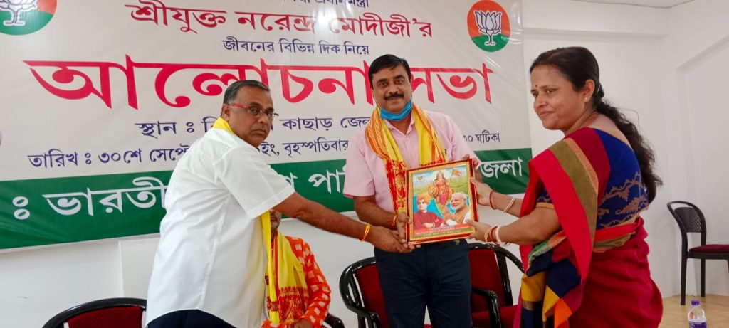 प्रधानमंत्री श्री नरेन्द्र मोदी जी के 71वें जन्मदिन के अवसर पर भारतीय जनता पार्टी कछार जिला ने जिले में 17सितंबर से 7 अक्टूबर तक विभिन्न गतिविधियों की योजना बनाई थी। इसी के तहत आज भाजपा के कछार जिला कार्यालय में चर्चा बैठक हुई. बैठक के प्रारंभ में भारत माता, श्यामाप्रसाद मुखर्जी और दीनदयाल उपाध्याय के चित्रों के सामने दीप, माल्यार्पण और बंदेमातरम् संगीत के साथ शुरुआत हुई। फिर आज के कार्यक्रम के वक्ताओं को भारत माता, स्वामी विवेकानंद और नरेंद्र मोदी की तस्वीरों वाला एक स्मृति चिन्ह सौंपा गया। बैठक के अध्यक्ष बिमलेंदू राय ने स्वागत भाषण दिया। इसके बाद वक्ताओं ने भाषण दिए। *”नरेंद्र मोदी और राष्ट्रीय स्वयंसेवक संघ”* को लेकर आरएसएस कार्यकारिणी सदस्य और प्रख्यात शिक्षाविद, लेखक और कवि *असित चक्रवर्ती *ने नरेंद्र मोदी के कार्यावली का वर्णन किया।