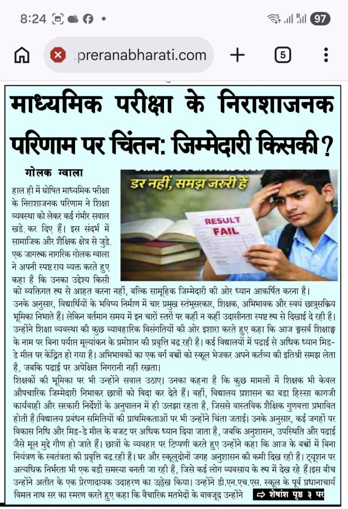 हाल ही में घोषित माध्यमिक परीक्षा के निराशाजनक परिणाम ने शिक्षा व्यवस्था को लेकर कई गंभीर सवाल खड़े कर दिए हैं। इस संदर्भ में सामाजिक और शैक्षिक क्षेत्र से जुड़े एक जागरूक नागरिक गोलक ग्वाला ने अपनी स्पष्ट राय व्यक्त करते हुए कहा है कि उनका उद्देश्य किसी को व्यक्तिगत रूप से आहत करना नहीं, बल्कि सामूहिक जिम्मेदारी की ओर ध्यान आकर्षित करना है।