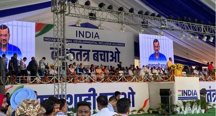रामलीला मैदान इंडिया गठबंधन की रैली की जा रही है. समाजवादी पार्टी के प्रमुख और उत्तर प्रदेश के पूर्व मुख्यमंत्री अखिलेश यादव, कांग्रेस महासचिव प्रियंका गांधी वाड्रा, झारखंड मुक्ति मोर्चा नेता और पूर्व सीएम हेमंत सोरेन की पत्नी कल्पना सोरेन, दिल्ली के सीएम अरविंद केजरीवाल की पत्नी सुनीता केजरीवाल, महाराष्ट्र के पूर्व सीएम उद्धव ठाकरे व गठबंधन के अन्य नेता मंच पर उपस्थित हैं. बिहार के पूर्व डिप्टी सीएम और राजद नेता तेजस्वी यादव, नेशनल कॉन्फ्रेंस प्रमुख फारूक अब्दुल्ला, पंजाब के सीएम भगवंत मान और अन्य भारतीय गठबंधन नेता दिल्ली के रामलीला मैदान में रैली में मौजूद हैं.