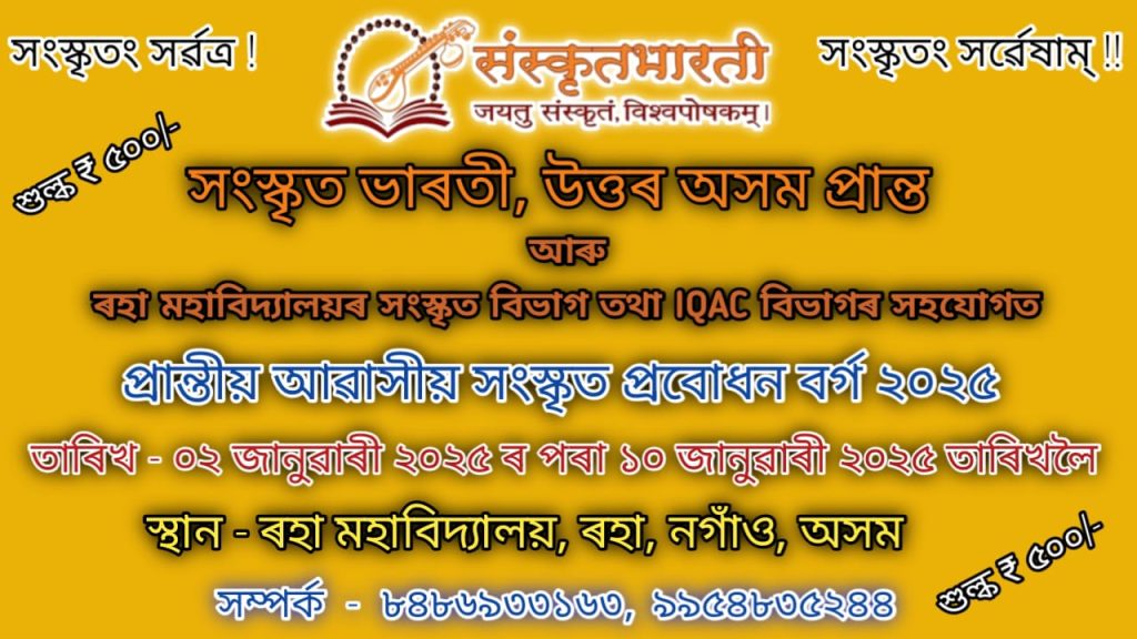 प्रे.स. रहा, असम, 29 दिसंबर: संस्कृत भारती, उत्तर असम प्रांत, और रहा महाविद्यालय के संयुक्त तत्वावधान में 2 से 10 जनवरी 2025 तक आवासीय संस्कृत प्रवोधन वर्ग (Residential Sanskrit Spoken Training Camp) का आयोजन किया जाएगा। इस कार्यक्रम का उद्देश्य संस्कृत भाषा का व्यावहारिक ज्ञान प्रदान करना और प्रतिभागियों को संस्कृत संवाद में दक्ष बनाना है।