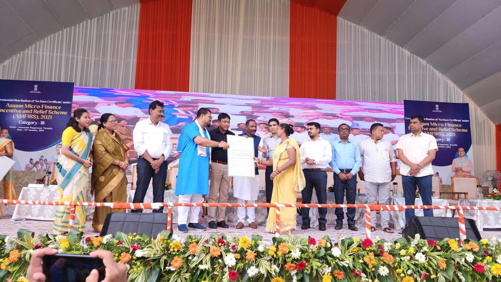 तिनसुकिया प्रेरणा भारती गोरखनाथ गुप्ता,16 अक्टूबर: असम माइक्रोफाइनेंस प्रोत्साहन और राहत योजना (एमएफआईआरएस), 2021 के तहत आज तिनसुकिया जिले के लाभार्थियों के बीच औपचारिक रूप से तीसरा चरण का ऋण भुगतान’ प्रमाण पत्र वितरित किया गया। कार्यक्रम में मुख्य अतिथि के रूप में असम सरकार के श्रम एवं चाय जनजाति कल्याण विभाग के मंत्री संजय किशान ने भाग लिया और लाभार्थियों को “ऋण भुगतान प्रमाण पत्र” वितरित किया। कार्यक्रम में श्रम मंत्री ने कहा कि असम के मुख्यमंत्री डॉ. हिमंत विश्व शर्मा के नेतृत्व वाली राज्य सरकार ने महिलाओं के सशक्तिकरण के साथ-साथ आर्थिक आत्मनिर्भरता के लिए भी कई कदम उठाए हैं। “असम माइक्रोफाइनेंस प्रोत्साहन और राहत योजना (एमएफआईआरएस),2021” के माध्यम से, असम की महिलाओं को लंबे समय से ऋण बोझ की समस्या का समाधान करने के साथ ही असम की महिलाओं को अर्थनैतिक रूप से सशक्त करने का प्रयास किया है। श्रम मंत्री ने यह भी उल्लेख करते हुए कहा कि सरकार के इस कदम से कई परिवारों के जीविका के आश की उम्मीद लगा दिया है।