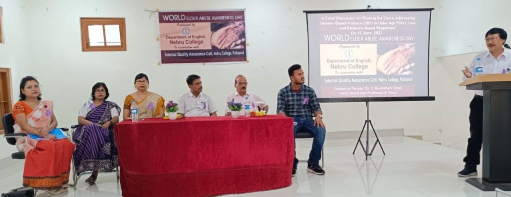 प्रे.सं.लखीपुर,१६ जुन : विश्व बुजुर्ग दुर्व्यवहार जागरूकता दिवस के अवसर पर आंतरिक गुणवत्ता मुल्यांकन विभाग एवं अंग्रेजी विभाग द्वारा , लखीपुर क्षेत्र के नेहरू कॉलेज पैलापूल में एक पैनल चर्चा का आयोजन किया गया। जिसमें एस एम देब कालेज लखीपुर के अंग्रेजी विभाग के सेवानिवृत्त आचार्य डा.वाई रासबिहारी सिंह संसाधन ब्यक्ति के रूप में उपस्थित थे। इस दिन के इस बिचार-विमर्श सभा में नेहरू कॉलेज के बंगला विभाग की आचार्या डॉ.मेधमाला महंता, एस एम देब कालेज के अर्थशास्त्र विभाग के आचार्य प्रभाकर सिंह, नेहरू कॉलेज के मणिपुरी विभाग के आचार्या डॉ.एस.मेरिना सिंह, अर्थशास्त्र विभाग के सहायक आचार्य, निहाल ज्योति दास ने भाग लिया। नेहरू कॉलेज के प्रधानाचार्य , डॉ.शुभजीत चक्रवर्ती की अध्यक्षता में आयोजित इस सभा का संचालन , इसी कालेज के अंग्रेजी विभाग के आचार्या डॉ.एल भारती सिंह ने किया।