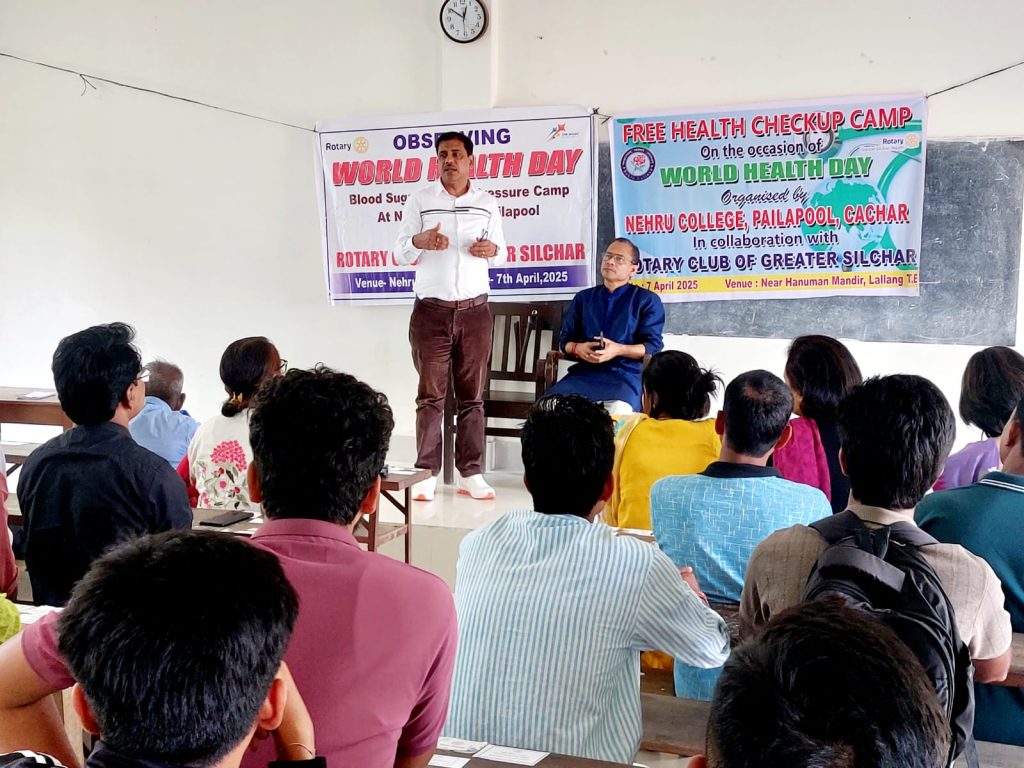 पैलापूल, 7 अप्रैल: विश्व स्वास्थ्य दिवस के अवसर पर नेहरू कॉलेज, पैलापूल में रेड रिबन क्लब (IQAC के अंतर्गत) द्वारा रोटरी क्लब ऑफ ग्रेटर शिलचर के सहयोग से एक निःशुल्क स्वास्थ्य जांच शिविर का आयोजन किया गया। यह शिविर कॉलेज के कमरा नंबर 11 में आयोजित हुआ, जिसका उद्देश्य विद्यार्थियों, शिक्षकों एवं स्थानीय समुदाय को स्वास्थ्य के प्रति जागरूक करना था।
