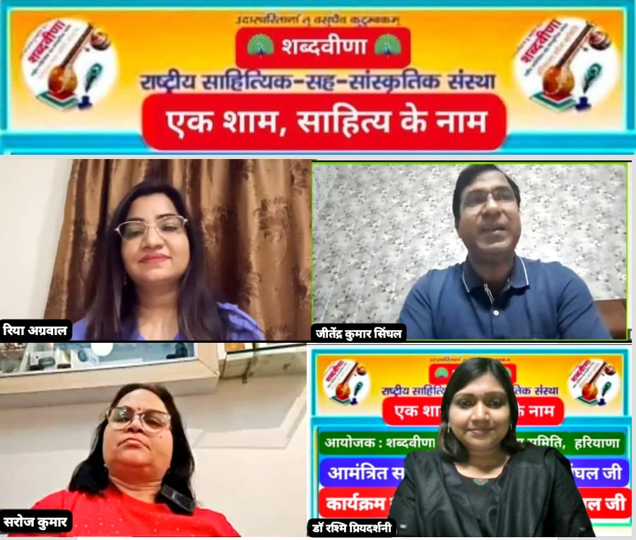 गया जी। राष्ट्रीय साहित्यिक एवं सांस्कृतिक संस्था ‘शब्दवीणा’ की हरियाणा प्रदेश समिति एवं फरीदाबाद जिला समिति के संयुक्त तत्वावधान में आयोजित फरवरी माह की साहित्यिक भेंटवार्ता ‘एक शाम, साहित्य के नाम’ में दिल्ली सरकार में हिन्दी के प्रवक्ता, लेखक व कवि डॉ जीतेंद्र सिंघल ने भाषा एवं साहित्य के विकास में व्याकरण के महत्व पर अपने विचार साझा किए। उन्होंने साहित्यिक एवं भाषायी एकरूपता तथा उत्कृष्टता बनाए रखने के लिए व्याकरण की समझ का होना अनिवार्य बताया। साहित्य के धर्म, मर्म, उद्देश्य, भाषा के विस्तार, साहित्यिक क्षेत्र में शोध कार्य को बढ़ावा दिये जाने पर बातचीत हुई। “एक शाम साहित्य के नाम” की संचालन प्रभारी कवयित्री रिया अग्रवाल ने डॉ सिंघल से वर्तमान समय में शिक्षा और साहित्य के व्यवसायीकरण पर भी प्रश्न पूछे। डॉ. सिंघल ने एक कथाकार, एक लेखक तथा एक समीक्षक के दायित्वों पर प्रकाश डालते हुए बच्चों को कहानियों एवं कविताओं से जोड़े जाने की आवश्यकता पर विचार रखे। उन्होंने वार्ताकार श्रीमती अग्रवाल के अनुरोध पर अपनी कुछ पसंदीदा अभिनेता स्वरचित कविताएँ भी प्रस्तुत कीं।