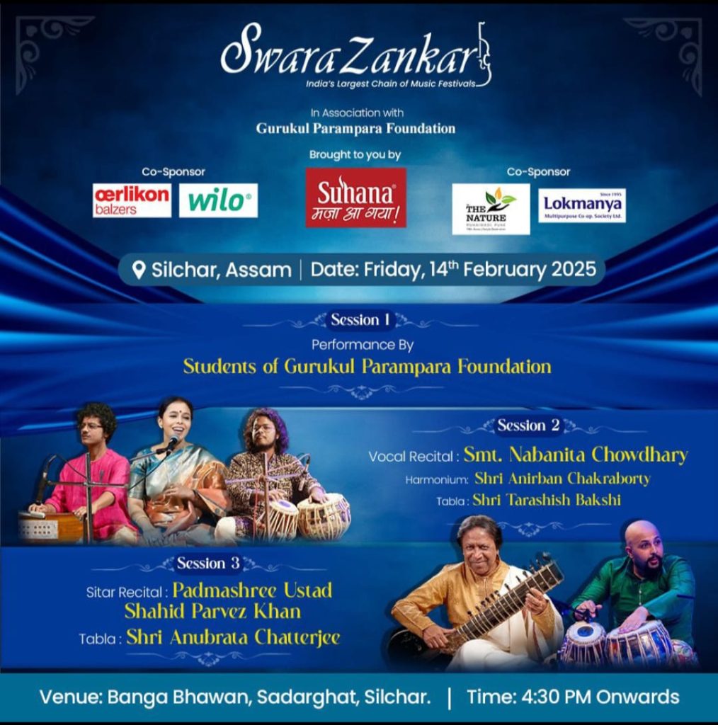 प्रे.स. शिलचर, 8 फरवरी – शास्त्रीय संगीत के प्रचार और प्रसार में समर्पित संगठन स्वरझंकार और शिलचर के गुरुकुल परंपरा फाउंडेशन के संयुक्त तत्वावधान में एक दिवसीय भव्य शास्त्रीय संगीत संध्या का आयोजन किया जा रहा है। यह कार्यक्रम शिलचर के बंग भवन में संपन्न होगा।