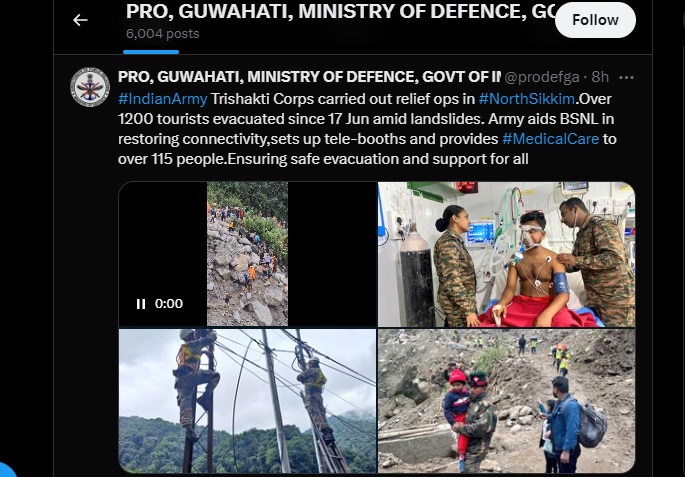 उल्लेखनीय है कि सिक्किम में पिछले हफ्ते बरसात के दौरान हुए भू-स्खलन में यह पर्यटक फंस गए थे। रक्षा मंत्रालय के जनसंपर्क अधिकारी का कहना है कि सेना संचार सुविधा बहाल करने में बीएसएनएल की सहायता कर रही है। टेली बूथ स्थापित किए जा रहे हैं। 115 से अधिक लोगों को चिकित्सा सुविधा प्रदान की गई है। पर्यटकों की सुरक्षित निकासी और सहायता पहली प्राथमिकता है।