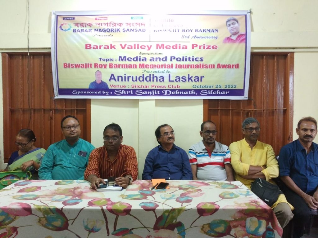शिलचर, 26 अक्टूबर: पत्रकार स्वर्गीय विश्वजीत राय बर्मन की तृतीय पुण्यतिथि पर आयोजित कार्यक्रम में शिलचर के वरिष्ठ पत्रकार अनिरुद्ध नस्कर को सम्मानित किया गया तथा समाचार माध्यम एवं राजनीति विषय पर विभिन्न वक्ताओं ने अपने विचार व्यक्त किए। उल्लेखनीय है कि स्वर्गीय विश्वजीत राय बर्मन वरिष्ठ पत्रकार और साहित्यकार अतीन दास के दामाद थे। एक योग्य कर्तव्यनिष्ठ करवट पत्रकार के रूप में पूरे आसाम में उनकी ख्याति थी। उनकी स्मृति में आयोजित कार्यक्रम की अध्यक्षता वरिष्ठ सामाजसेवी संजीत देव नाथ ने की। मुख्य अतिथि के रूप में असम विश्वविद्यालय के मास काम विभाग के प्रोफ़ेसर पार्थ सरकार उपस्थित थे। कार्यक्रम का संचालन शिलचर नागरिक संसद के प्रमुख तथा प्रेस क्लब के सचिव शंकर दे ने किया।