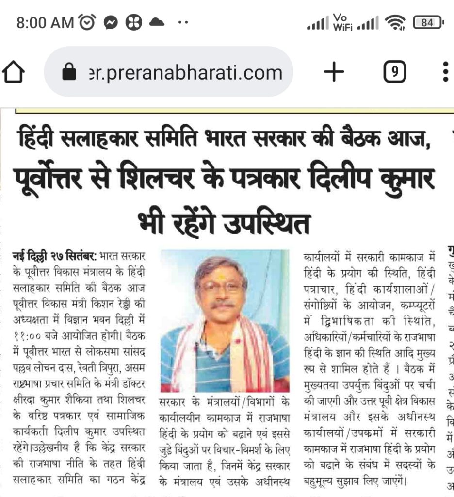 हिंदी सलाहकार समिति भारत सरकार की बैठक आज, पूर्वोत्तर से बैठक में शिलचर के पत्रकार दिलीप कुमार भी रहेंगे उपस्थित